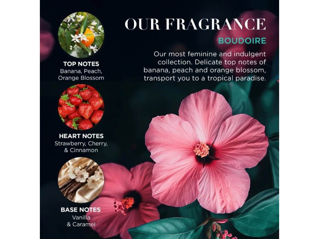 Trendy kolekcia Boudoire - Tropical Paradise prináša exotický kvetinový dizajn s moderným nádychom a štipkou luxusu. Odvážna paleta fuchsiovej ružovej a smaragdovo zelenej je doplnená zlatými detailmi, ktoré celej rade dodávajú výnimočný charakter. Ošetrujúce produkty a nádherné darčekové sady sprevádza tropická vôňa banánu, broskyne a pomarančového kvetu.