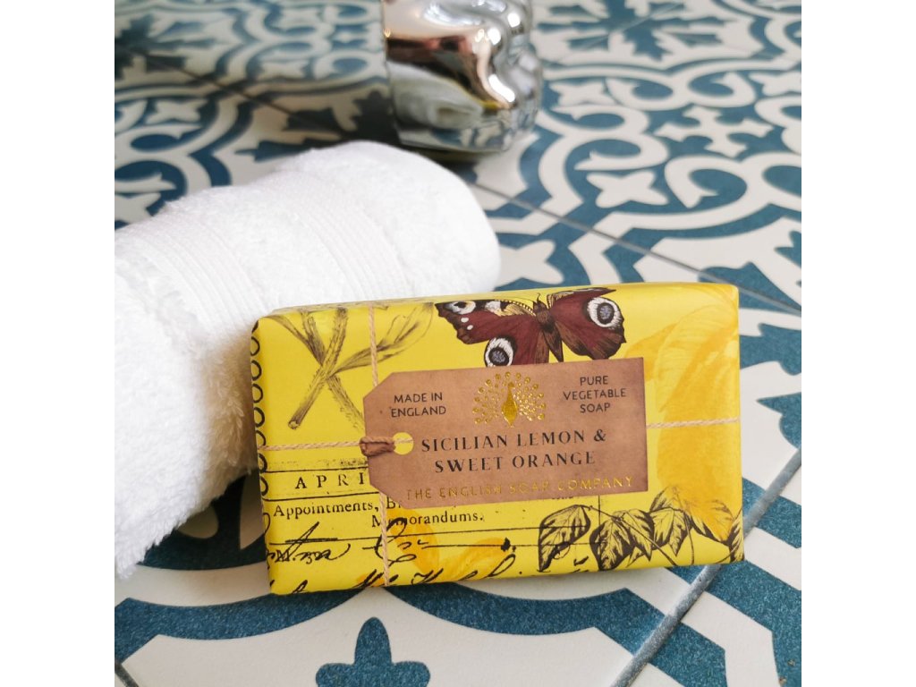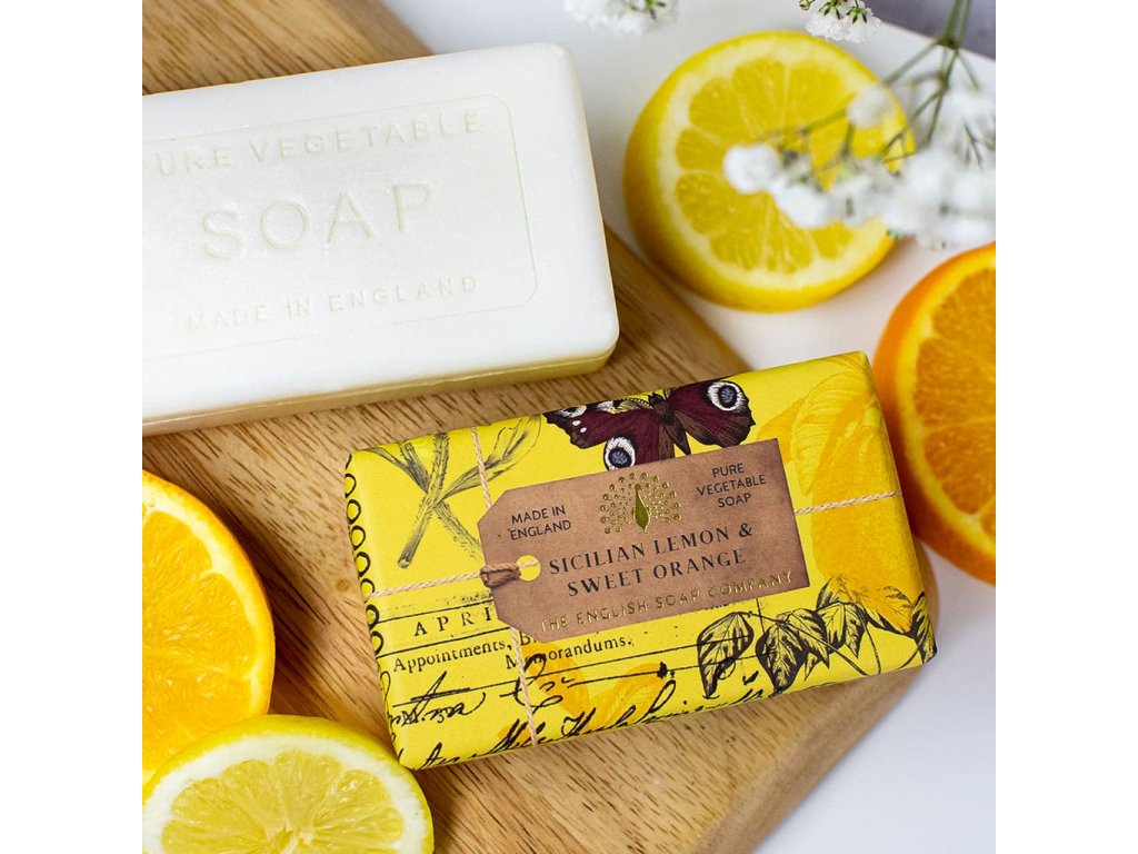 Krásne voňajúce, vegánske, luxusné mydlo vhodné na každodenné použitie. Vyrobené z čistých rastlinných olejov a obohatené o bambucké maslo pre luxusnú penu, ktorá udrží vašu pokožku vyživenú. Toto výročie sicílske mydlo s citrónom a sladkým pomarančom je zabalené do plne recyklovateľného papiera a zdobené pestro maľovanými ilustráciami inšpirovanými prírodou. Perfektný doplnok do vašej kúpeľne alebo ideálny darček pre niekoho výnimočného.
