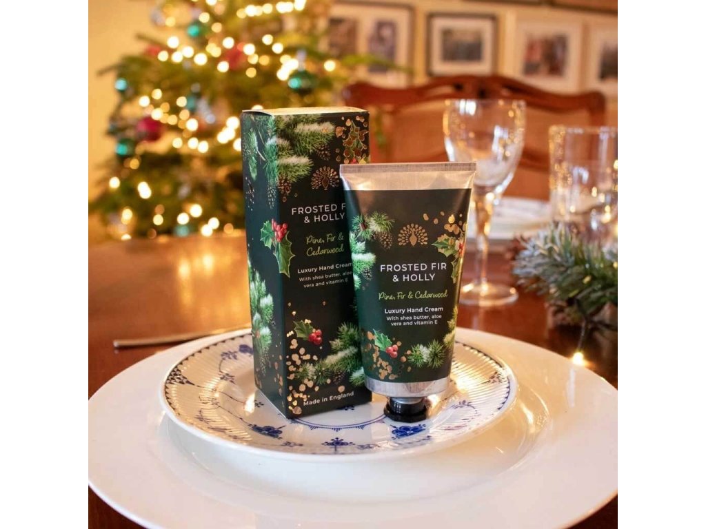 Objavte čaro Vianoc s luxusným krémom na ruky Frosted Fir & Holly od English Soap Company! Tento krém je obohatený o vyživujúce bambucké maslo, upokojujúce aloe vera a vitamín E, ktoré vašej pokožke dodajú hĺbkovú hydratáciu a starostlivosť, ktorú si zaslúži aj v tých najchladnejších dňoch.