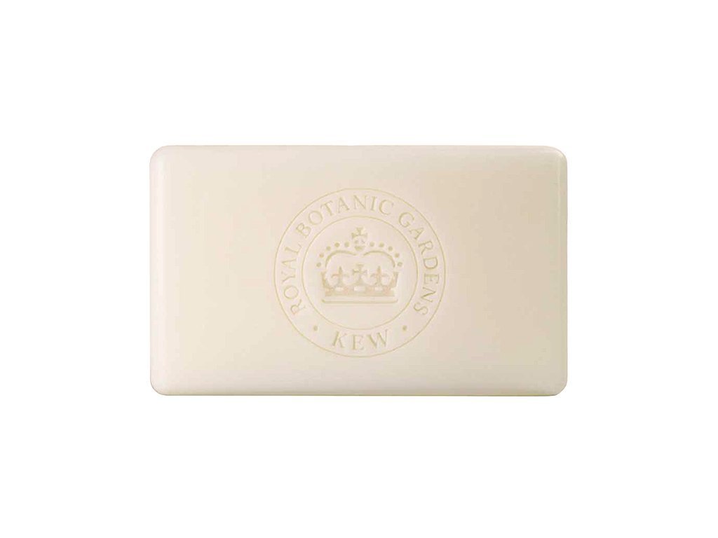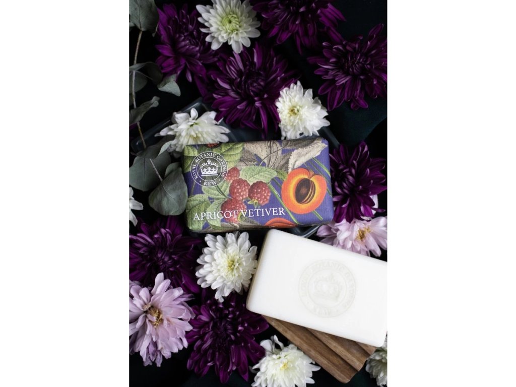 Kew Gardens Apricot Vetiver Soap má sviežu, šťavnatú vôňu šťavnatej broskyne a marhule vedúcej k bohatému sviežimu srdcu exotického manga, malín a floridského pomaranča zvýrazneného jemnou sladkou nektárinkou. Základ má veľmi jemné pižmové tóny a jemné akordy ružového dreva.
