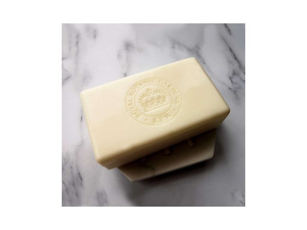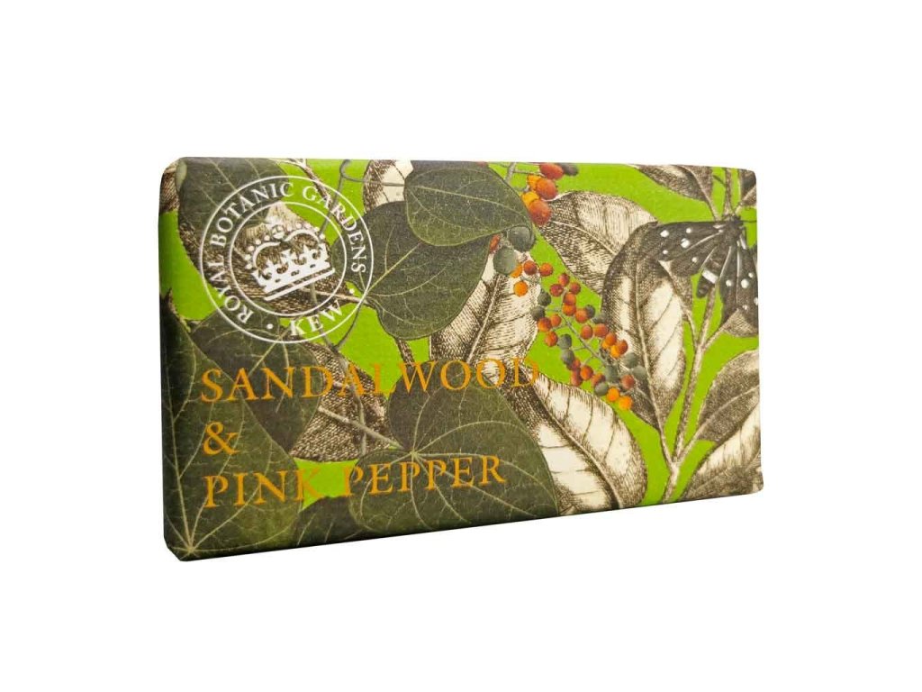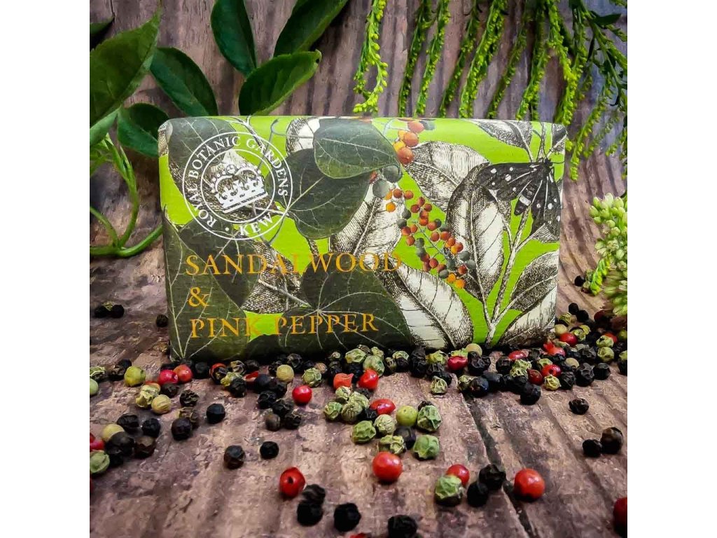 Mydlo Kew Gardens Sandalwood a Pink Pepper je jedným z exkluzívnych mydiel v kolekcii Kew Gardens. Veľkoryso veľká 240g kocka mydla, ktorá je dlhotrvajúca a obohatená o hydratačné bambucké maslo a rastlinný glycerín pre výživu a starostlivosť o pokožku. Papierové obaly sú potlačené krásnymi ilustráciami inšpirovanými rastlinami z historických archívov Kew Gardens.