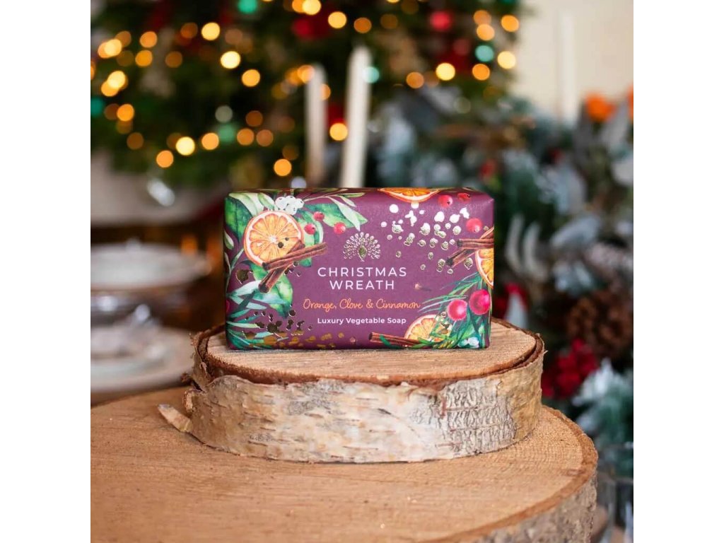 Mydlo vianočný veniec má vôňu škorice a pomaranča. Nádherná zmes pikantného pomaranča a citrónu s hrejivými tónmi škorice a nádychom klinčeka. Zažite túto sviatočnú vôňu, ktorá vyžaruje dekadenciu.