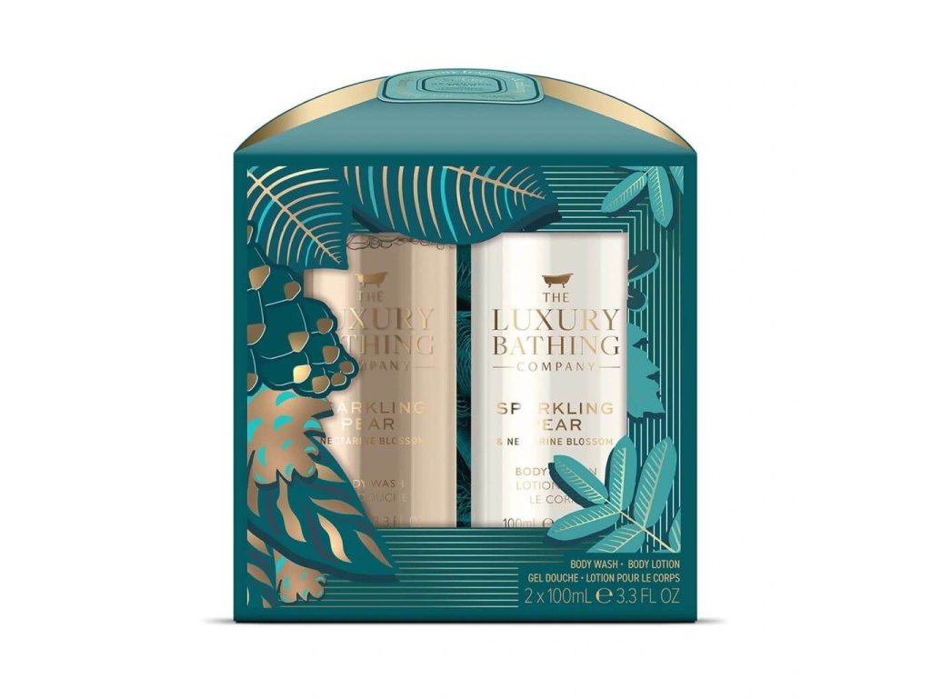 Darčeková kolekcia Sparkling Pear & Nectarine Blossom je svojím dizajnom v odtieňoch zlatej, tyrkysovej a zelenej nápadná a elegantná. Obsahuje produkty starostlivosti o telo vhodné pre ženy vo veku 40+. Typická anglická vôňa ponúka šťavnaté tóny grepu, hrušky a pomaranča miešajúce sa s ružou, čiernymi ríbezľami, kvapkou neroli a fialkou. Drevitý základ pižma, jantáru a santalového dreva spolu s jemným nádychom vanilky zanecháva dlhotrvajúci dojem.