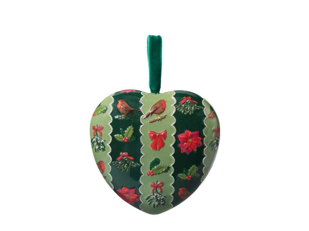 Plechovka je zdobená zvlnenými stuhami s motívmi veselých červienok, červených mašlí a imela na prednej strane a psíkmi a mačkami v roztomilých svetríkoch a šáloch na zadnej strane. Ide o očarujúci darček alebo ozdobu do pančuchy, ktorú si môžete zavesiť na stromček pomocou smaragdovo zelenej zamatovej stuhy.