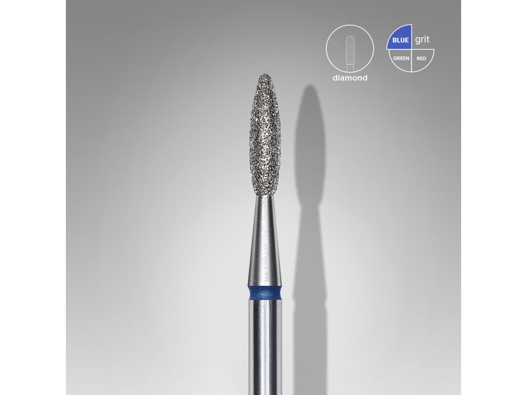 Modrá (stredne hrubá) diamantová frézka plamienok. Priemer pracovnej časti 2,1 mm/dĺžka pracovnej časti 8 mm.