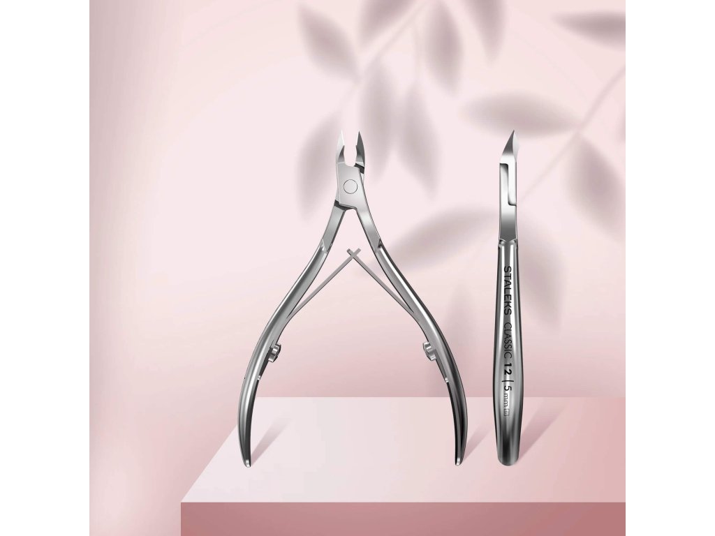 Staleks Classic profesionálne kliešte NC-12-5 sú kliešte na kožtičku so šikmými britmi vyrobené z kvalitnej nehrdzavejúcej ocele lekárskej kvality. Ergonomický dizajn pracovnej časti je ideálny na manikúru aj pedikúru.
