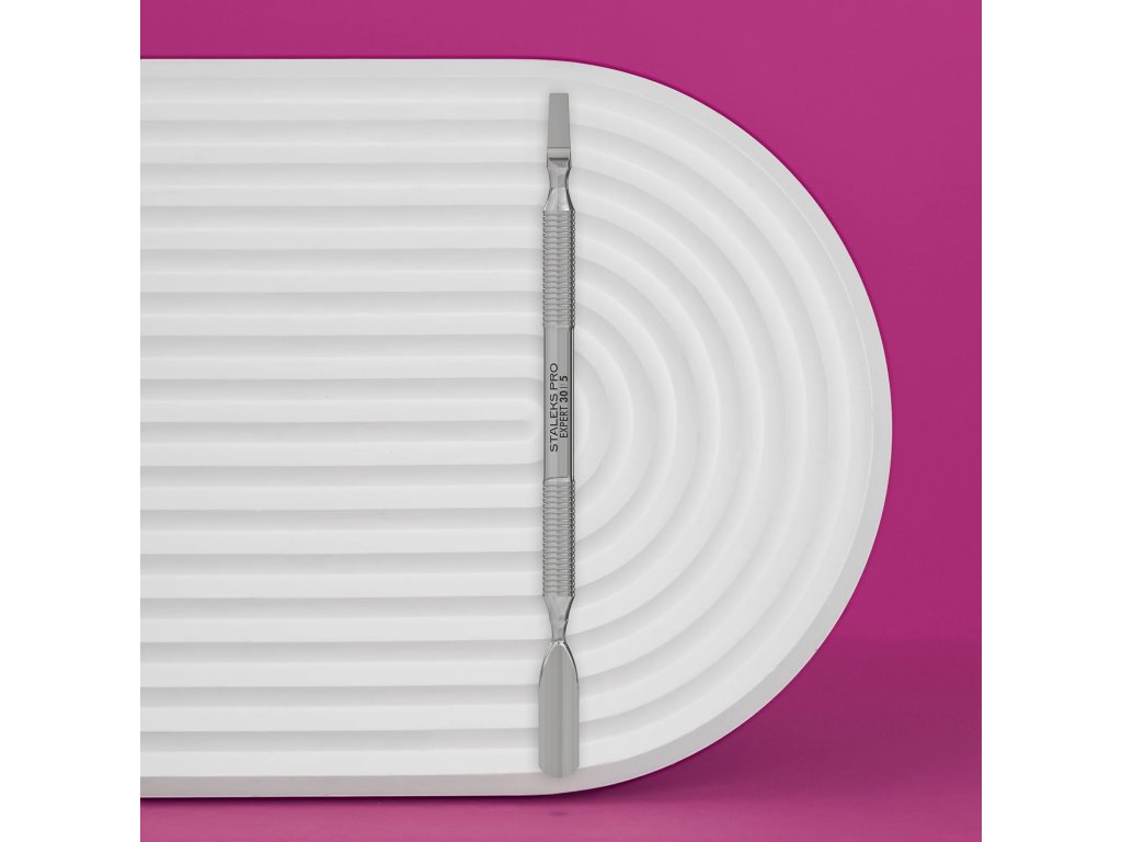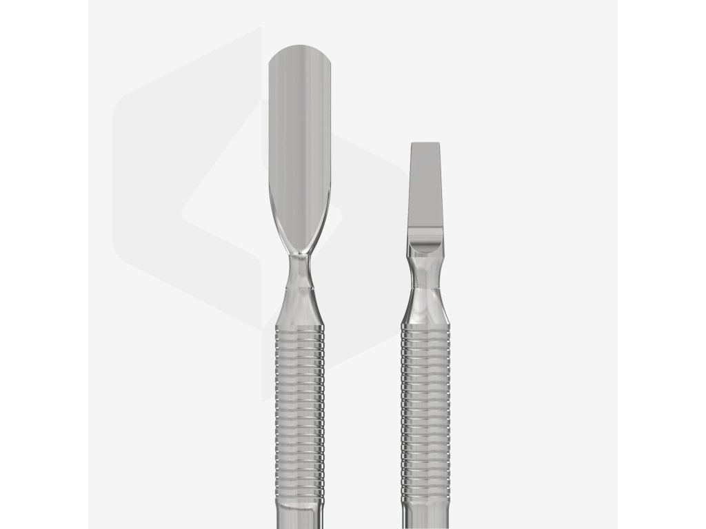 Profesionálny dvojitý zatláčač – na jednej strane široký zaoblený zatláčač, na druhej strane čepeľ na odstránenie silne narastenej kožtičky.
